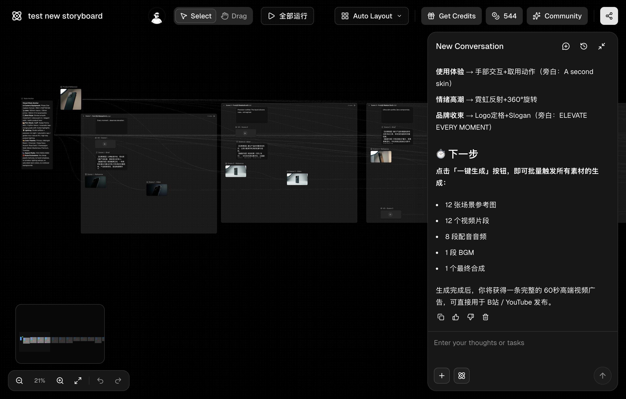 用自然语言描述你的需求。AI Agent 自动调度合适的模型、同时生成图像、视频和音频素材并在画布上组装一切——只需一条指令。它能在一个工作流中调度多个 AI 模型,并在无限画布上自动排布素材,根据你的反馈实时迭代优化。